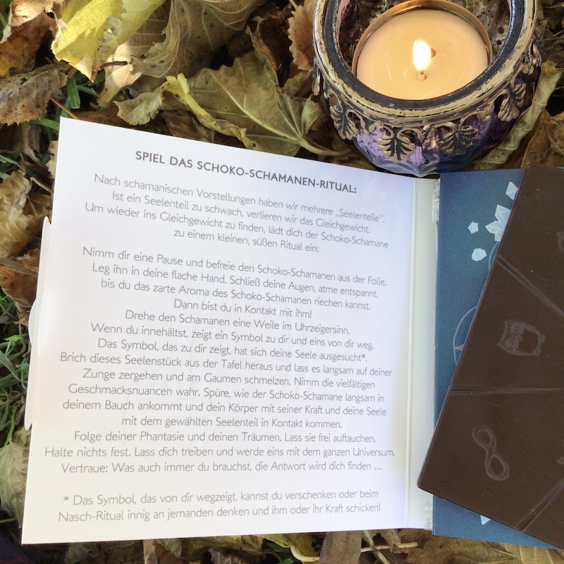 Auf der aufgeklappten Innenseite lädt eine Anleitung zum "Schoko-Schamanen-Ritual" ein: