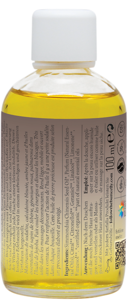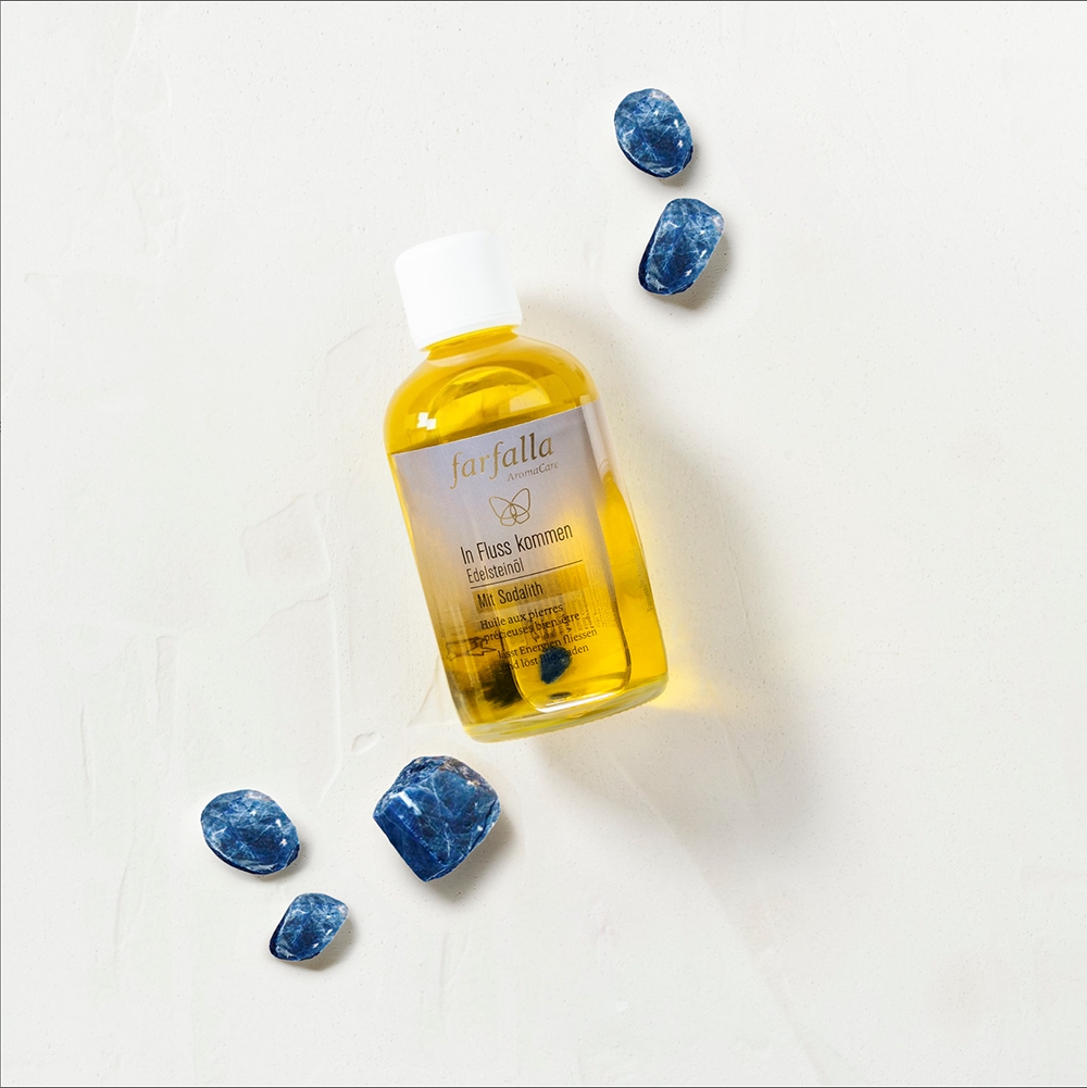 Mazeration von Sodalith, Blauer Chalcedon und Bernstein in Jojobaöl und den ätherischen Ölen Fichtennadel, Rosengeranie, Palmarosa.
