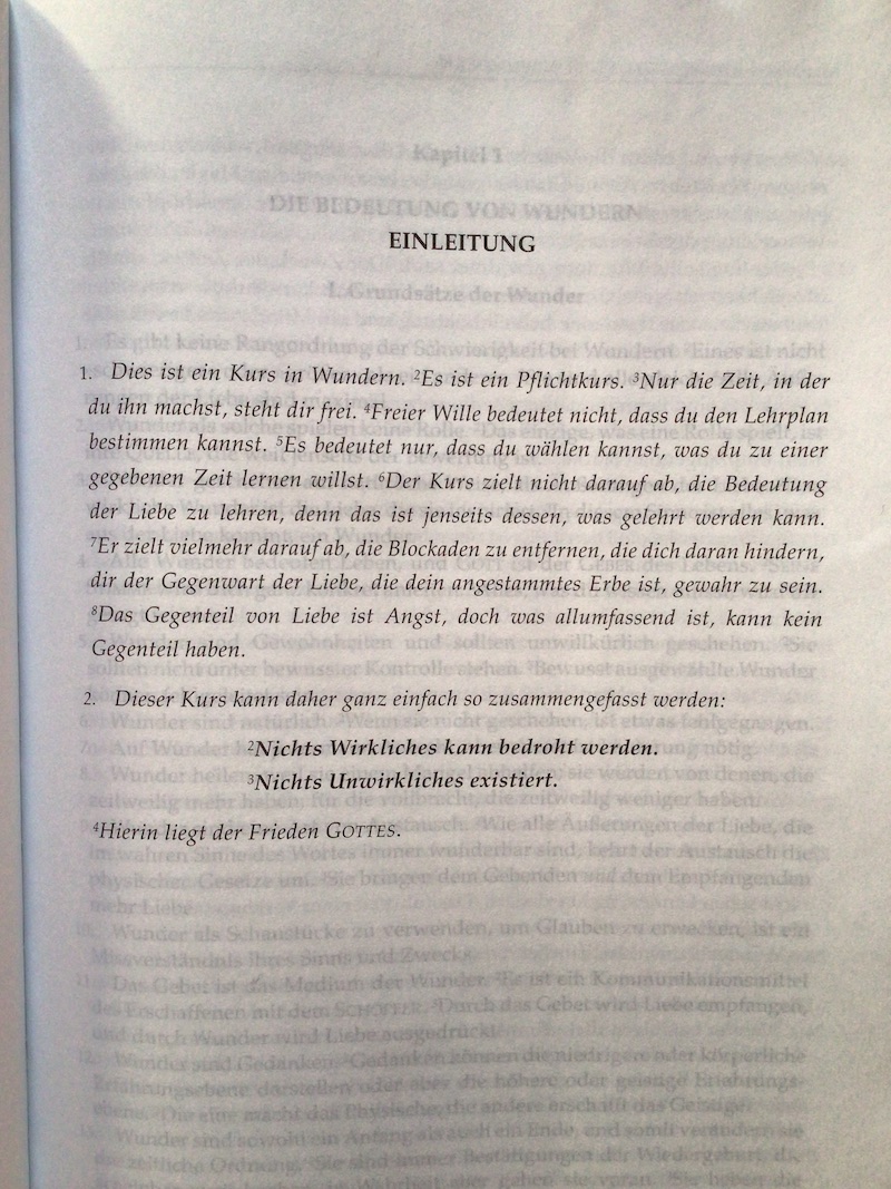 EIN KURS IN WUNDERN ist aufgrund seiner Synthese von zeitlosen geistigen Einsichten und wesentlichen psychologischen Erkenntnissen einzigartig unter den spirituellen Traditionen der Welt. Er zeigt uns einen Weg zu innerem Frieden, zu einem Dasein, das in der Welt, aber nicht von der Welt ist. Der Kurs ist nicht als Grundlage für eine neue Religion, Bewegung oder Vereinigung gedacht. Vielmehr dient er unabhängig von äußeren Autoritäten dem Selbststudium. Er richtet sich an Menschen, die nach einer friedlicheren Betrachtungsweise für ihr Leben und ihren Alltag suchen. Das Werk besteht aus dem Textbuch, dem Übungsbuch und dem Handbuch für Lehrer. Im Textbuch werden die Konzepte dargelegt, auf denen das Denksystem des Kurses gründet. Die darin enthaltenen Gedanken stellen die Grundlage für die 365 Lektionen des Übungsbuches dar, bei denen das Hauptgewicht auf der täglichen Erfahrung durch die Anwendung liegt. Das Handbuch für Lehrer gibt Antworten auf viele Fragen, die sich beim Studium ergeben. Wunder im Sinne des Kurses haben nichts mit unerklärlichen Phänomenen in der Außenwelt zu tun, sondern sind ausschließlich innere Veränderungen, die uns daran erinnern, dass es tief in uns verborgen eine Identität der Liebe gibt, die keinen Angriff, sondern nur Frieden kennt.